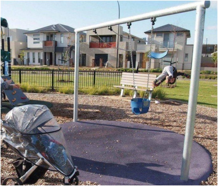 Ouch! We bet the person clicking the picture wishes they were near the baby instead of behind the camera. As far as perfectly timed photos go, this is quite an accurate click of a child flying off the swing, but we cannot help but hope he wasn't hurt too badly on falling to the ground.