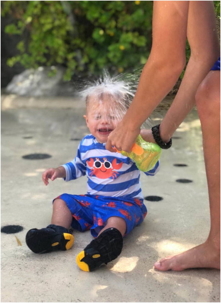 Parents are always ready with their cameras to capture every move their toddler makes, and that's how you end up with an album full of memories. We are glad that the camera was handy somewhere as this particular moment in the image too was worth capturing. The baby is too small to be in the pool age did not stop him from enjoying the water.