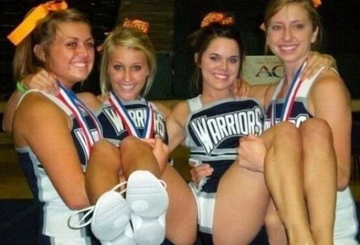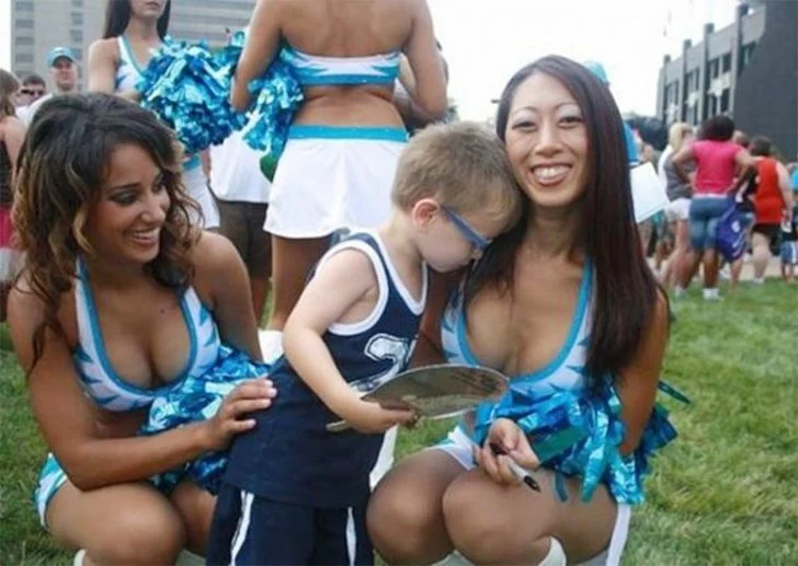 Children, with their unfiltered innocence, often don't grasp the social nuances that adults do, which is likely why this little boy’s captivated stare at a woman’s cleavage seems so innocent and charming. Captured in this snapshot, he’s surrounded by young women who appear to be cheerleaders—a role synonymous with energetic routines and team spirit, largely dominated by women today.
