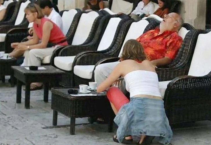 This isn’t a case of “womanspreading”; it’s a cleverly staged illusion. The two women in the center aren’t lounging independently but are suspended by their friends on either side. Look closely, and you’ll spot the giveaway—there are four legs at play, not just two!