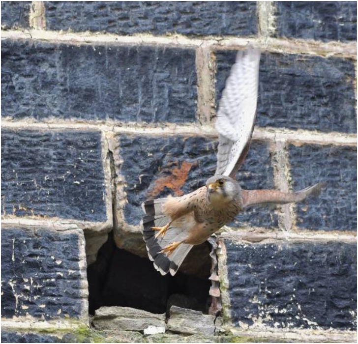 Sometimes we can take freedom for granted, and there's a high chance this bird also felt that way before getting stuck inside a stone building. We don't know how the creature got there, but it was not a cozy stay by the look of things. Judging by the blurry wings, this avian predator is clearly flying to its freedom at full speed.