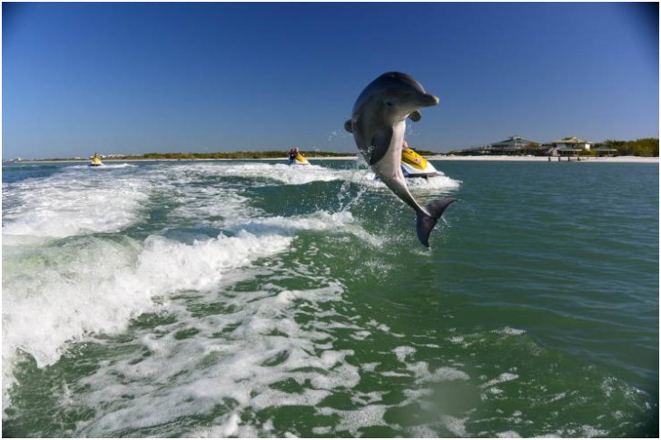 Yet, some might also suggest that these people were training the dolphin for a show. So, it performed fascinating stunts, jumping in and out of water. Whatever be the case, the photographer got lucky in having an incredible picture of the moment.