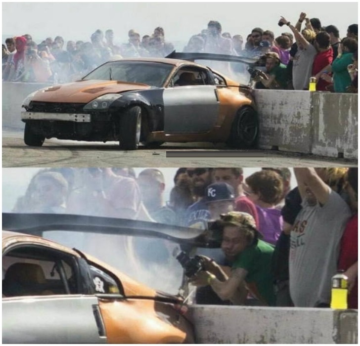 The pain that the poor chap must have felt can be seen and felt through this picture clearly. For once, we even stood up from our comfy chairs to salute this man for the kind of dedication he has for his work. He didn't even mind getting smacked across his face by this wild car.