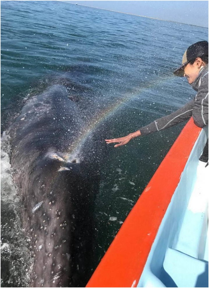 Cruising across a sea on a nice boat is always refreshing and soothing for the soul, and it's just a cherry on top when our eyes meet the sight of a big fish peeping out of the water. This man in the picture was very lucky to have witnessed a whale from such a small distance.