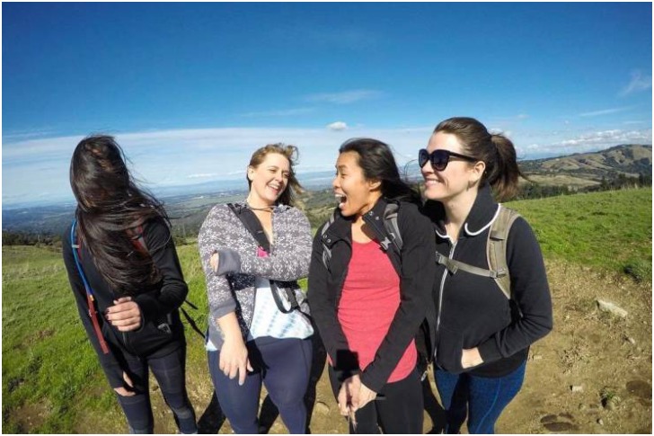 What's cool about this picture is the reactions observed in it. Two ladies haven't yet noticed what the wind is doing to their partner's hair, so they are standing in an unmindful way, though one woman in pink definitely became aware of it at this moment. Her facial expression is priceless as it adds another sweet attribute to the situation!