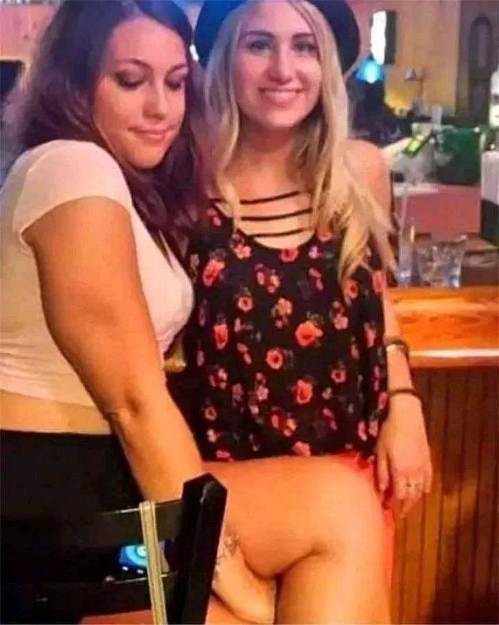 At first glance, it seems like the blonde girl on the right is missing her pants, but look closer—what you’re actually seeing is her friend’s bare legs perfectly lined up behind her. So, don’t worry, everyone is still fully dressed and behaving just fine!