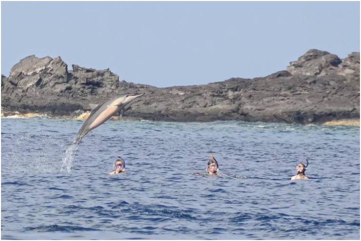 It is not every day that humans get to play with the most friendly marine species out there, dolphins. So, this image is truly an excellent shot, and these three people are indeed lucky ones. Doesn't it look like they were swimming in the sea and, after a chance meeting with this dolphin, got involved in fun games?