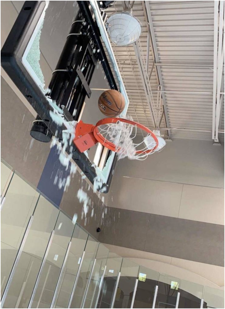 Still, it appears cool for basketball fans as well as players to smash the backboard and rain shards of glasses, doing a slam dunk. This picture precisely illustrates one of such moments. Also, the ball here seems to have entered the basket and bounced out as the photographer clicked the photo - How fascinating!