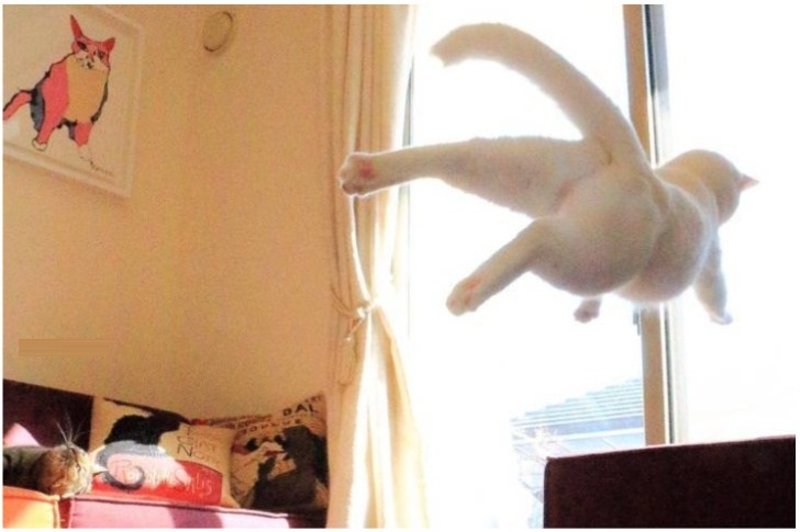 Folks have divided opinions about who qualifies as a cuter pet, cats or dogs. So let's spare that discussion for now and appreciate this feline's jumping expertise. There is no use explaining what events preceded the leap, but we're a bit perplexed, trying to decipher the speed of this furry mammal based on its hind paws.