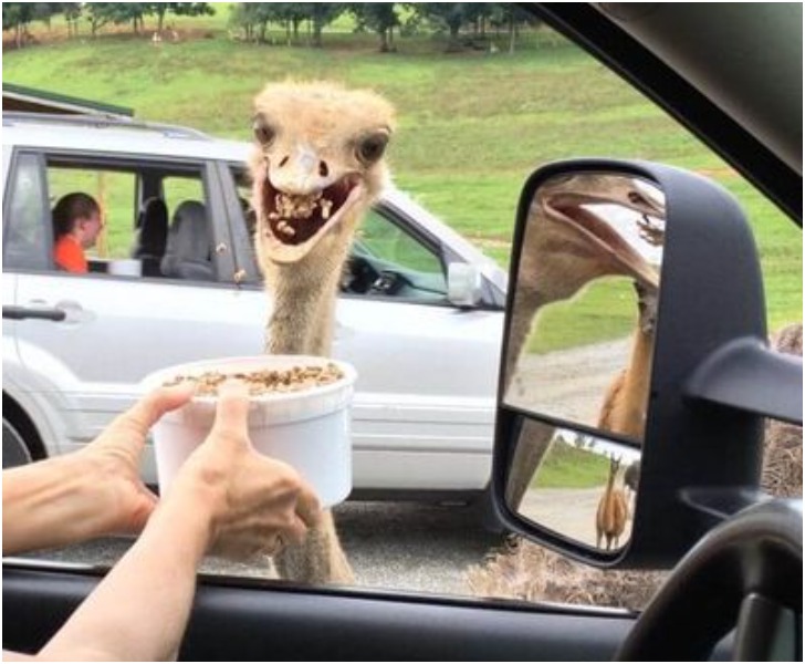 Remember in junior school when you had to write an essay about a visit to the park? This right here would have made for a grand essay, no? The thrill of being out in the wild and getting to feed an ostrich is unmatched, especially if you can't see the food you just put into its mouth from the car's side-view mirror.