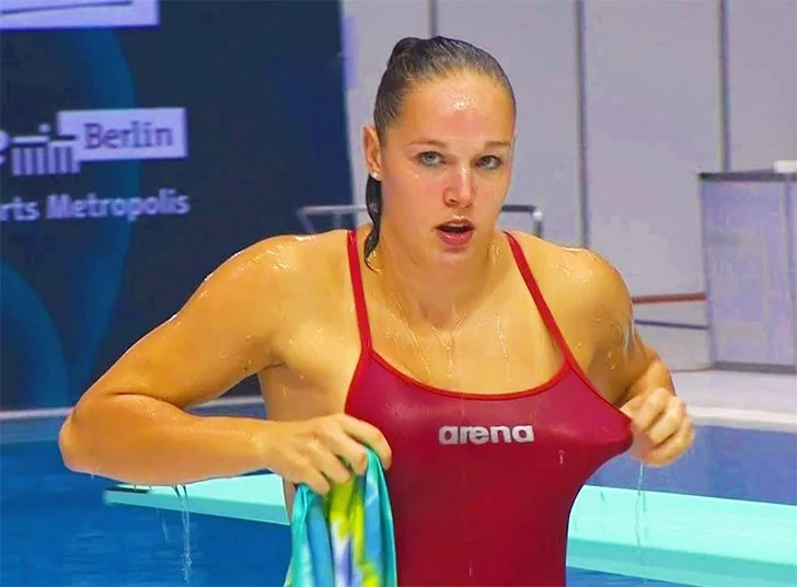 However, in this instance, the angle and timing of the adjustment create an unusual optical illusion, making it seem as though the swimmer's breasts are uneven, with the right appearing far more pronounced than the left.