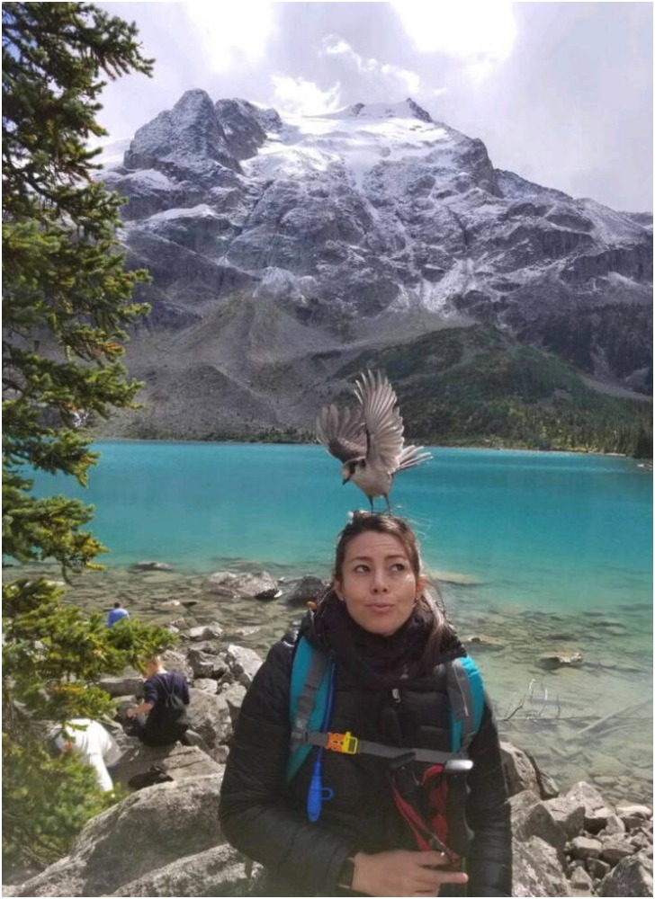 Is there anything more healing than nature walks? Enjoying the beauty of the mountains and the streams while hiking is a refreshing experience. Add a couple of random encounters with wayward birds and animals on your trek, and it becomes a wholesome one. Unplanned, the bird perching itself on the woman's head would have come as a complete shocker at first.