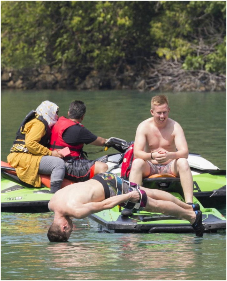 Have you heard the saying that timing is important? This well-timed click has captured something unique—never has anyone seen such a bizarre way of diving into the water for a swim. It so happens the people on the neighboring boat aren't too bothered either. On the other hand, the diver's buddy seems to find his horizontal head-first diving tactic super entertaining.